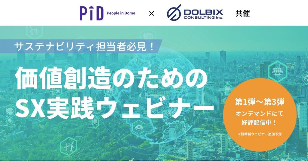 「Cyanoba(シアノバ)」をはじめとするESGテックを提供する株式会社PID(ピーアイディー/本社:東京都港区、代表取締役:田子 智志、以下 「PID」)は、ドルビックスコンサルティング株式会社(以下、「ドルビックス」)と共催し、「価値創造のためのSX(サステナビリティ・トランスフォーメーション)実践」をテーマとしたオンデマンドウェビナーを開催します。本ウェビナーでは、カーボンニュートラルの基礎からカーボンフットプリント(CFP)・情報開示等、SXに関する内容をトピック毎にシリーズ形式でご紹介いたします。